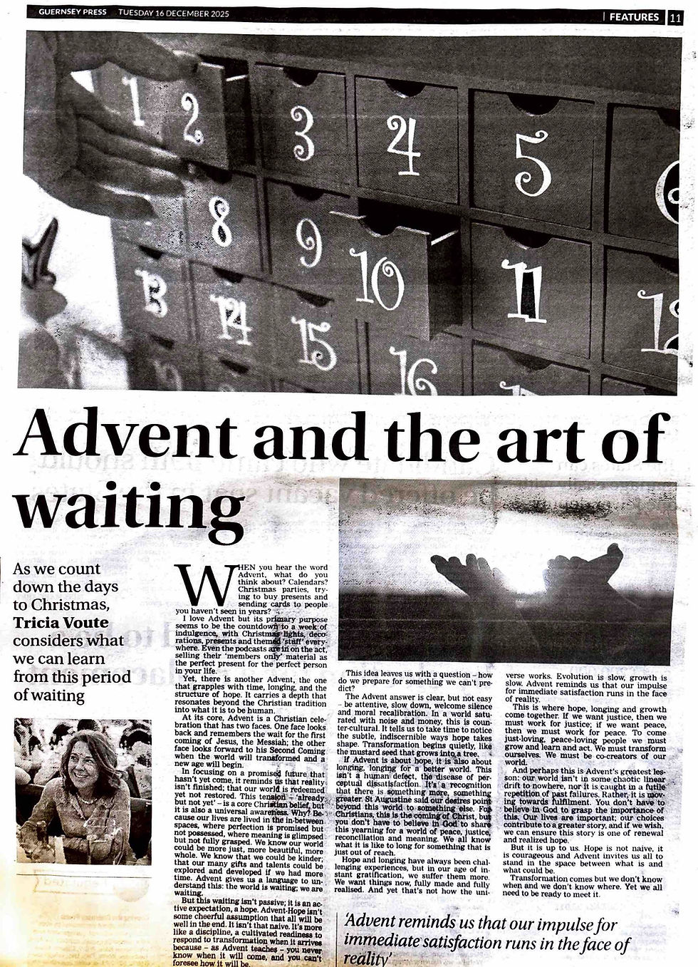 where meaning is glimpsed but not fully grasped. We know our world could be more just, more beautiful, more whole. We know that we could be kinder; that our many gifts and talents could be explored and developed if we had more time. Advent gives us a language to understand this: the world is waiting; we are waiting.
