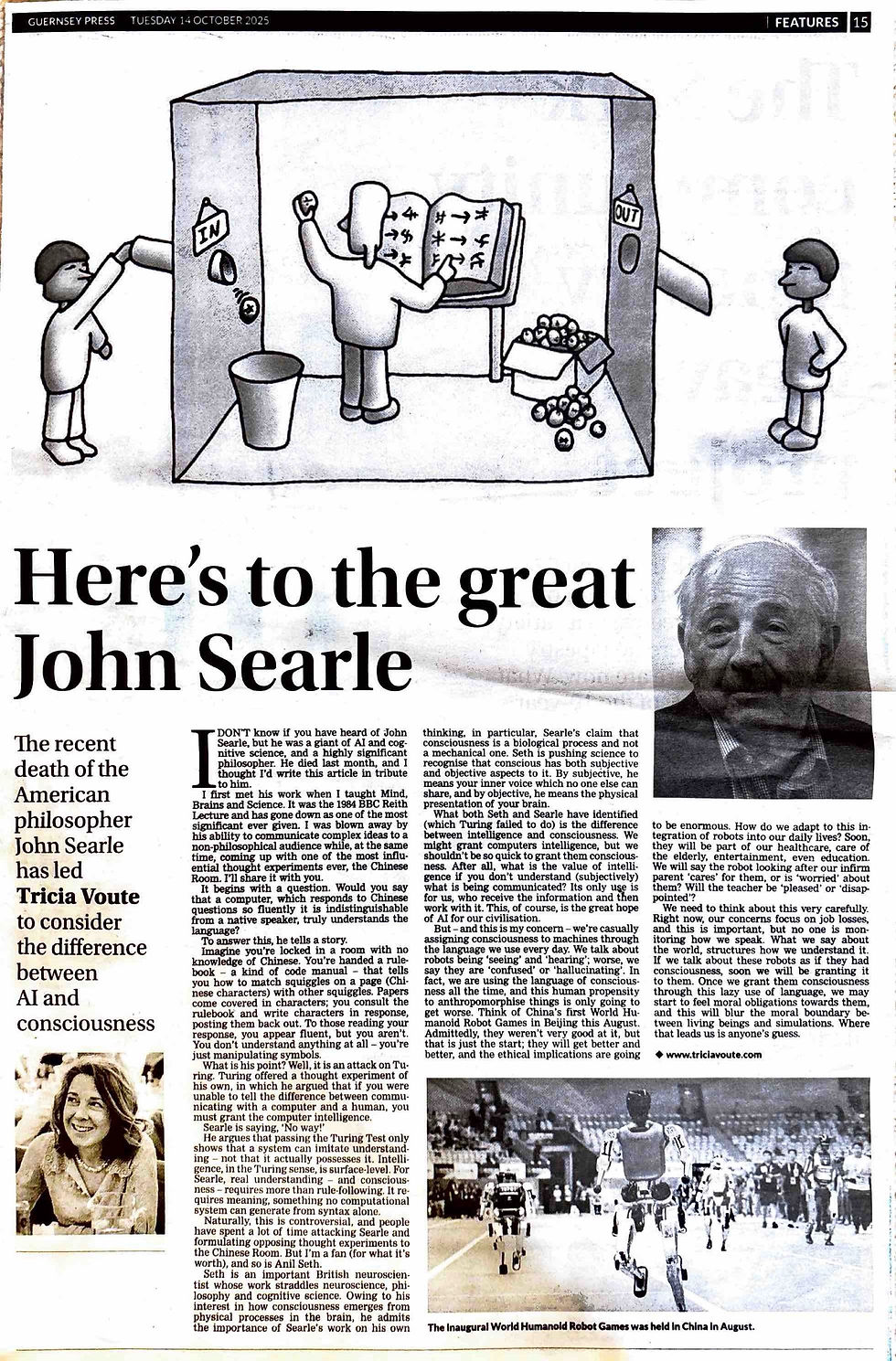 I first met his work when I taught, ‘Mind, Brains and Science’. It was the 1984 BBC Reith Lecture and has gone down as one of the most significant ever given. I was blown away by his ability to communicate complex ideas to a non-philosophical audience while, at the same time, coming up with one of the most influential thought experiments ever, The Chinese Room. I’ll share it with you.